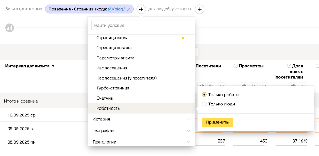- Killbot: убирает заходы ботов и удаляет поведенческих ботов из поиска. При его использовании каждый визит в Яндекс Метрике определяется как «бот» или «не бот», что позволяет оценить эффективность брендформанс-кампании.