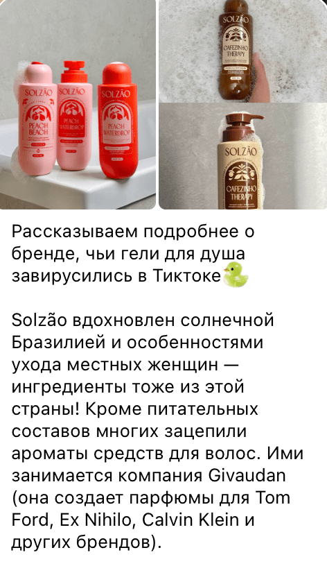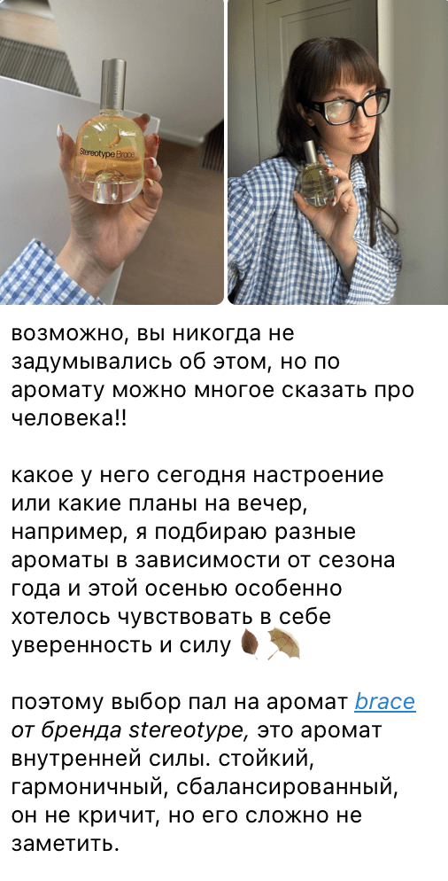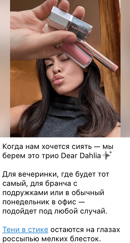 1. Демонстрация продукта через его органичное встраивание в рутину блогера на примере его Telegram-канала (косметические средства, продукты питания, предметы декора, одежда);