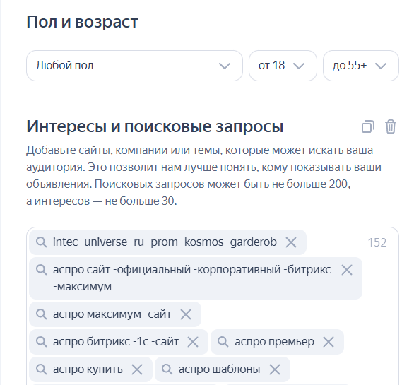 Для более точного показа объявлений нужно также указывать минус-слова – запросы, по которым не отображается реклама. Так вы сможете избавиться от нерелевантных переходов.