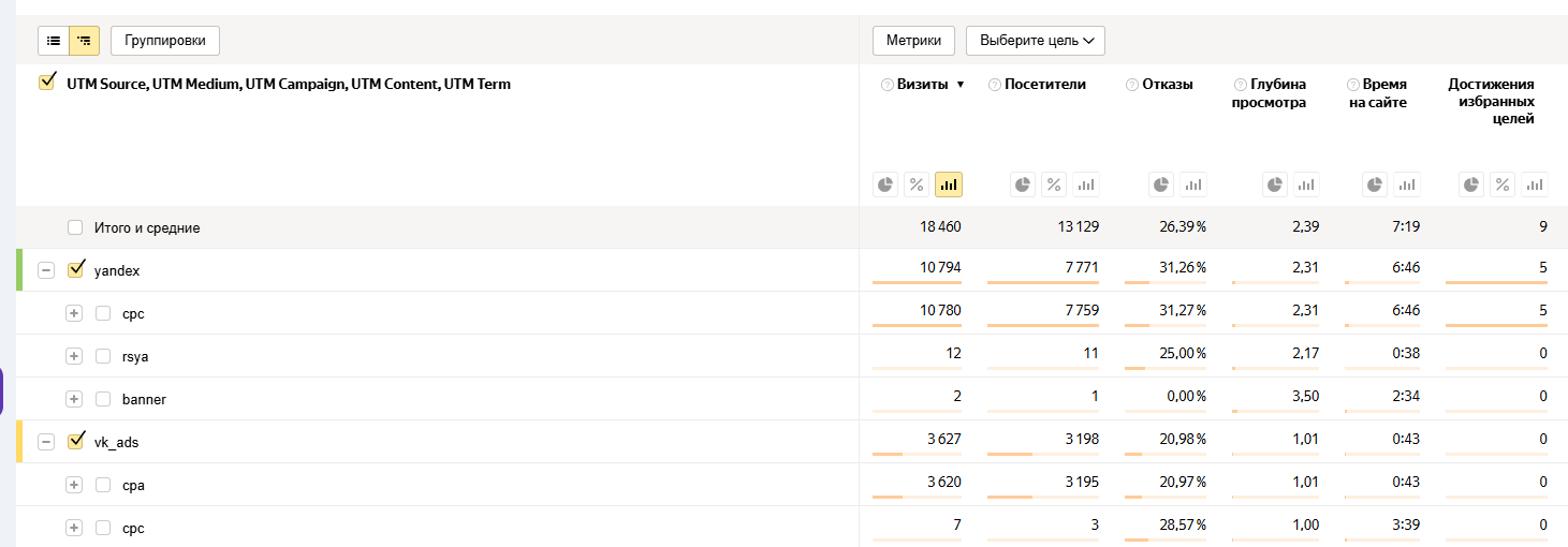 Пример отчета по UTM-меткам в Яндекс Метрике для рекламного трафика