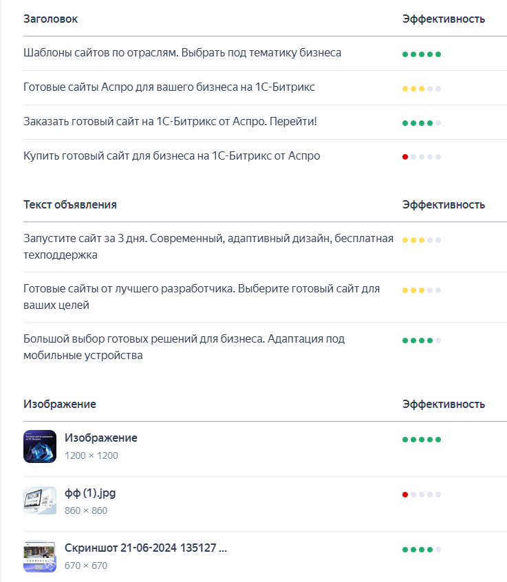 В Яндекс Директ можно посмотреть эффективность каждого заголовка, текста и изображения на одном экране