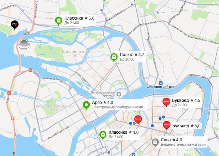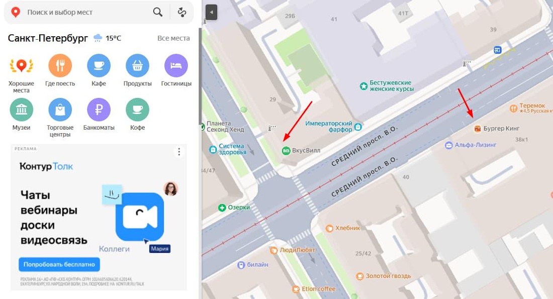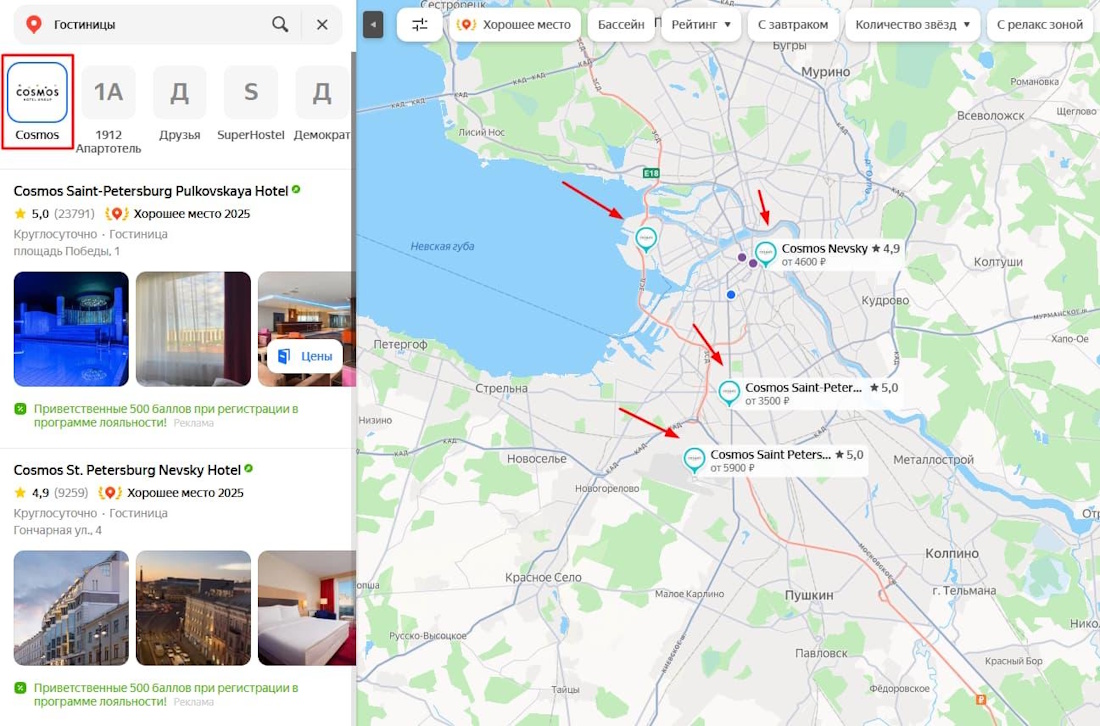 Есть также приоритетное брендированное размещение с POI-меткой (point of interest) – компания будет заметна на карте, даже если пользователь еще не начал поиск.