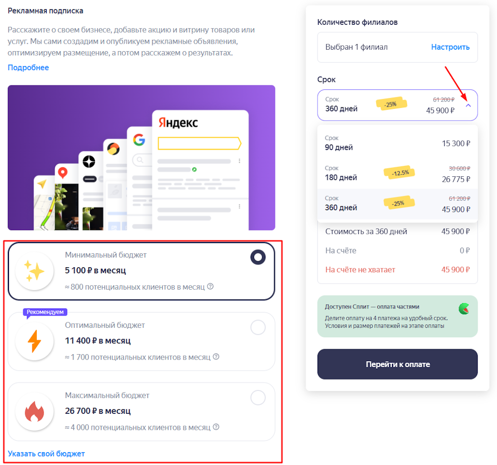 Минимальный срок, на который получится разместить рекламу на Яндекс Картах, – три месяца (90 дней). Кампанию можно также запустить на 180 и 360 дней. Выгоднее размещаться на более длительный срок. При продолжительности кампании 180 дней скидка составит 12,5%, 360 дней – 25%. Кроме того, действуют скидки от 5% на рекламу связанных организаций.
