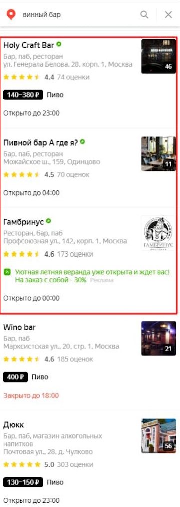 В десктопной и мобильной версии Яндекс Карт и на поиске Яндекса для рубрик «Авто», «Медицина», «Красота» и «Еда» работает поиск по прайс-листам. Это значит, что пользователь может найти кафе не только по названию или типу (суши-бар, пиццерия), но и по названию отдельного блюда. Подробно о загрузке прайс-листов и требованиям к ним – в Справке.
