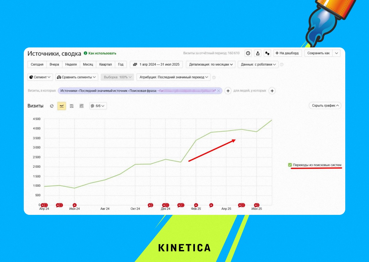 Мы в KINETICA понимаем, что SEO – не просто про ключевые слова и ссылки, а про создание устойчивых и доверительных отношений с аудиторией. Поэтому давно перестали делать ставку на сиюминутные тактики и ориентируемся на долгосрочный успех наших клиентов, что позволяет избегать распространенных ошибок:
