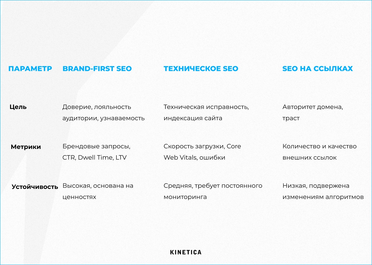 Brand-First SEO отличается от традиционного подхода не только по меткам, но и по стратегическому фокусу. Команда KINETICA фокусируется на формировании доверия, а не только на технической оптимизации.