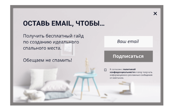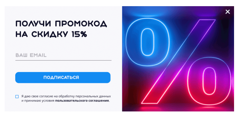 Сам по себе такой сценарий слабый – клиент еще не готов к заказу и не видит смысла оставлять контакт. Конверсия заметно растет, если сразу предложить конкретную выгоду: скидку, бонусы или промокод. В этом случае пользователь получает реальный стимул оставить email, а бизнес – шанс превратить интерес в реальную покупку и одновременно пополнить базу подписчиков.