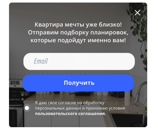 Подборка планировок в обмен на email на сайте недвижимости дала конверсию 0,98% и прирост базы – 0,34%
