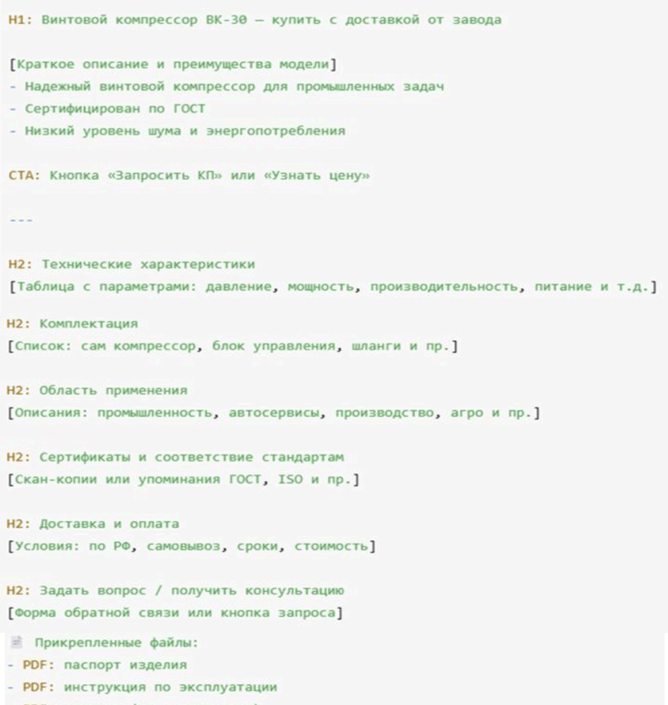 формирует «скелет» текста – четкий план с заголовками, блоками, списком обязательных характеристик и CTA, по которому копирайтеры пишут тексты.