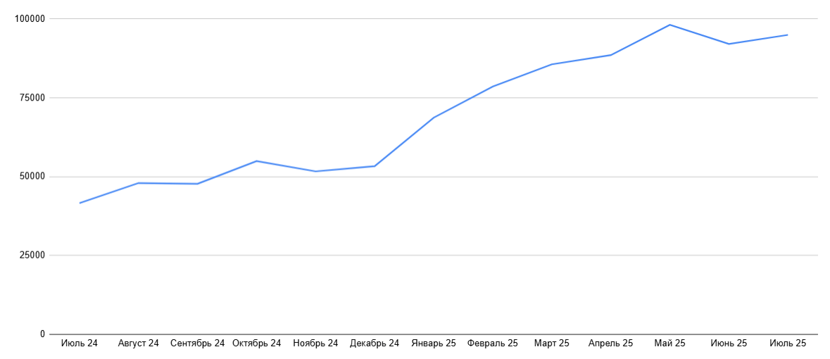 Клиент внес необходимые правки, и буквально сразу трафик сайта ракетой взлетел вверх. С апреля по июль 2025 трафик вырос примерно на 25 000 визитов в месяц, а год к году – в 2,28 раза.