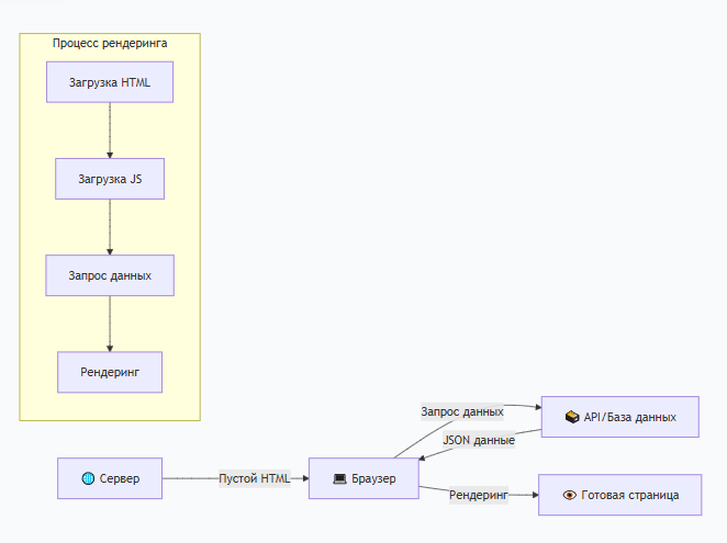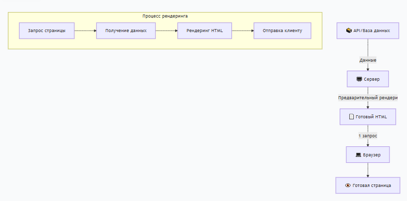 При серверном рендеринге (на хостинге) весь процесс обработки кода происходит на сервере во время сборки сайта. Пользователю отправляется уже готовый HTML с расставленными тегами и классами для стилизации. Вся страница полностью отрисована и контент доступен.