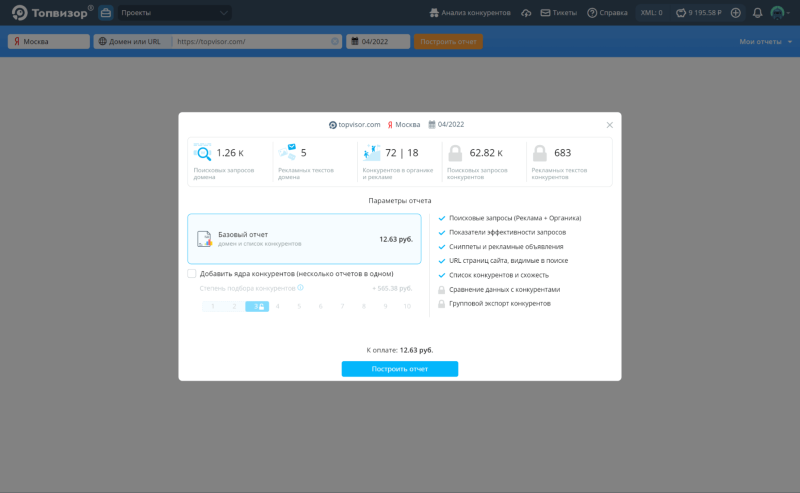 Топвизор соберет данные и покажет, какое количество запросов удалось найти для вашего сайта и сколько будет стоить отчет: