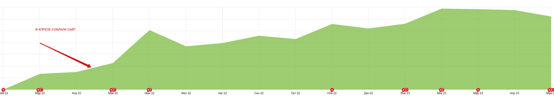| Антон Платонов: «Покажу на примерах, почему лучше сразу делать SEO-friendly-сайт. Пример 1. Проект связан с поставками медицинского оборудования. Проект нишевый и имеет высокую конкуренцию. Сайт сделан на конструкторе. Мы поработали с сайтом в течение марта – после этого предложили клиенту сделать новый сайт сразу под SEO. В апреле собрали сайт с проработанной структурой, внедрили коммерческие факторы, проработали архитектуру URL и оптимизировали сразу все страницы. Смотрите, как начал расти трафик: