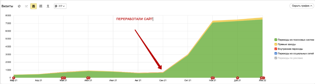 Клиент работает с нами до сих пор. Пример 2. Проект связан с продажей кислородного оборудования. ЦА – рядовые потребители и владельцы медицинских кабинетов. Здесь ситуация немного другая: в работу пришел проект, который долгое время пытались оптимизировать несколько разных агентств. Мы тоже пару месяцев тестировали различные гипотезы, оптимизировали страницы – в общем, искали подход к проекту. После пары неудачных месяцев мы согласовали полную переделку сайта – переработку структуры, внедрение коммерческих факторов, работу с архитектурой URL, работу со структурой заголовков, расширение, чистку и кластеризацию семантики. Смотрите, как начал расти трафик: