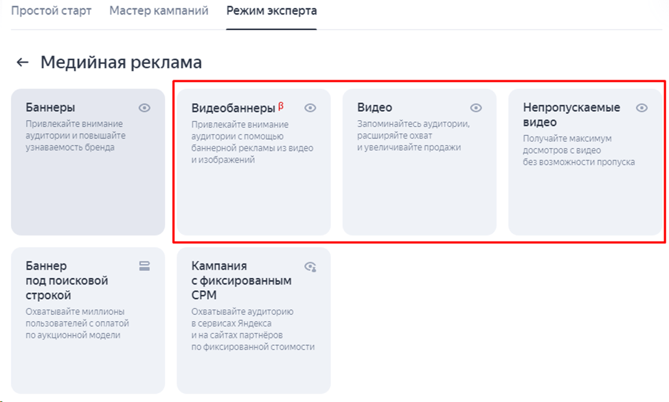 Для медийной рекламы создается отдельная кампания. В Директе доступны два интерфейса добавления – базовый и профессиональный. Эксперты рекомендуют второй, так как он дает больше возможностей для гибкой настройки.