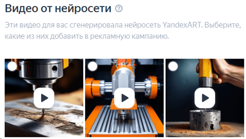 Помимо собственных роликов, система предлагает дополнительные варианты: видео, собранные из изображений объявления, а также клипы, созданные нейросетью YandexART. Это экономит время и расширяет выбор форматов.
